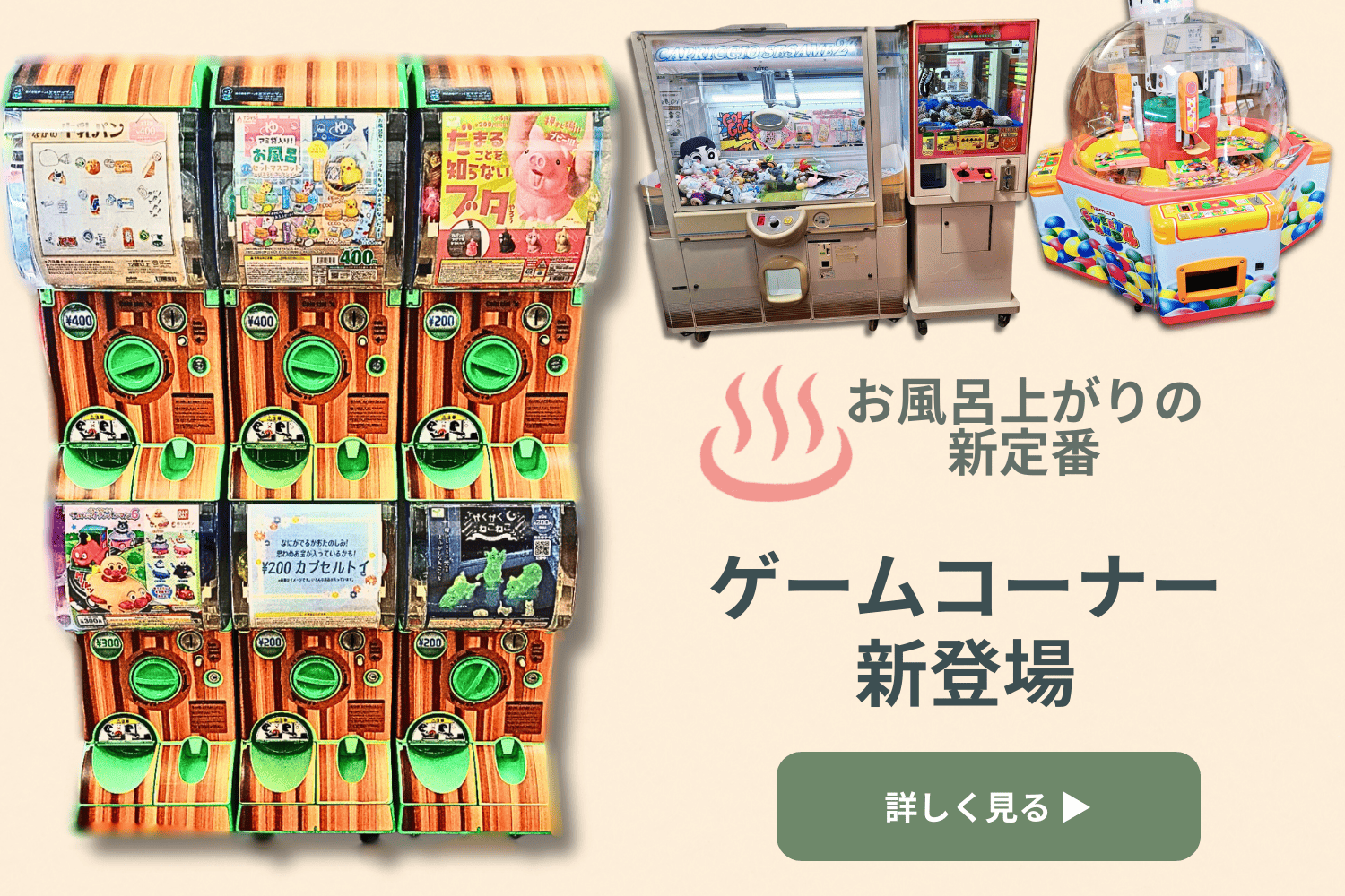 地元生産者が育てた旬の野菜や果物の直売コーナーもあり、温泉同様に好評いただいています。お菓子などの販売コーナーやマッサージ機もございます。